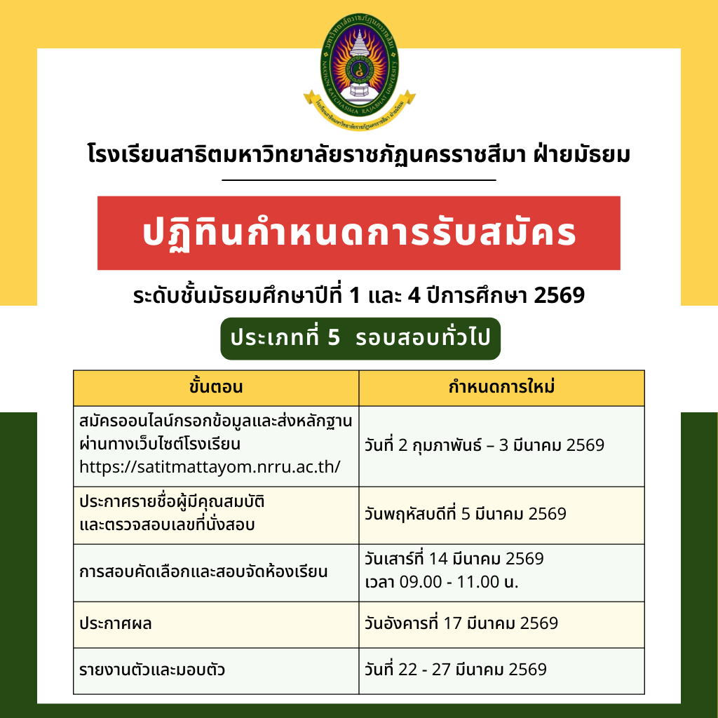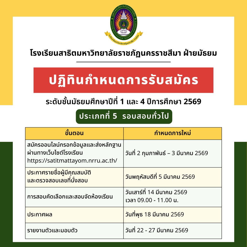 ประกาศกำหนดการรับนักเรียนเข้าศึกษาต่อระดับชั้นมัธยมศึกษาปีที่ 1และระดับชั้นมัธยมศึกษาปีที่ 4 การศึกษา 2569 ประเภทที่ 5 รอบสอบทั่วไป