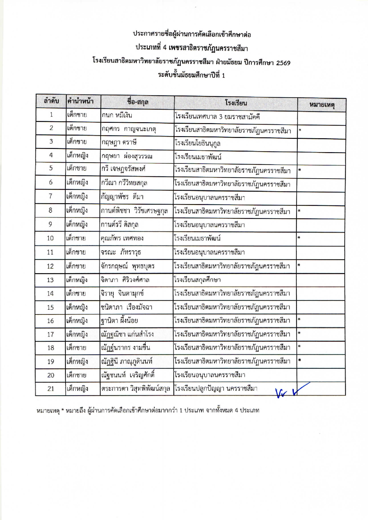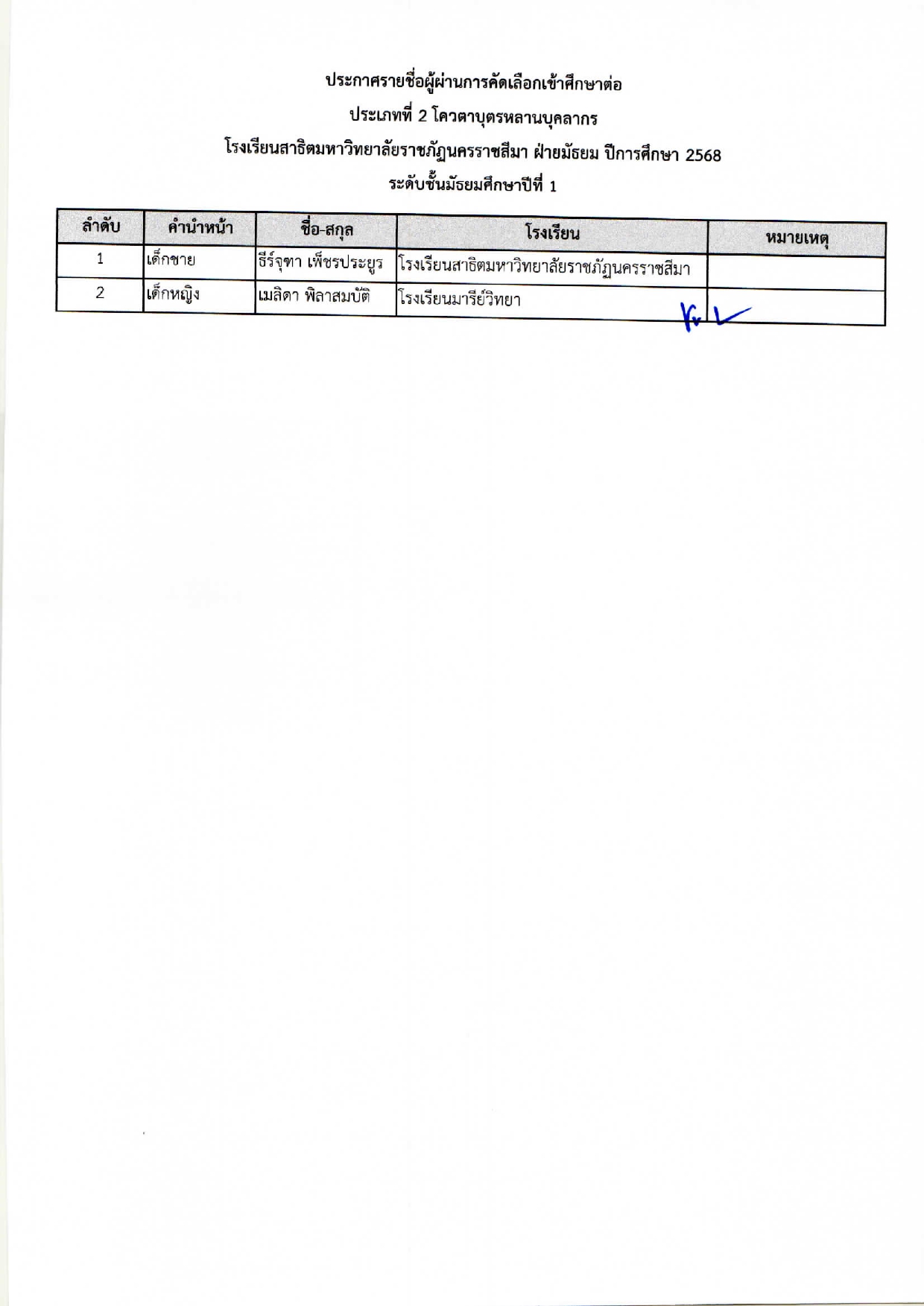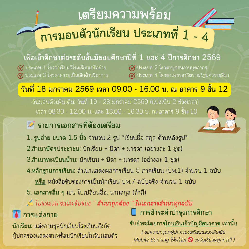 ประกาศรายชื่อผู้ผ่านการคัดเลือกเข้าศึกษาต่อในชั้น มัธยมศึกษาปีที่ 1 และชั้นมัธยมศึกษาปีที่ 4 ประเภทที่ 1-4 ปีการศึกษา 2569