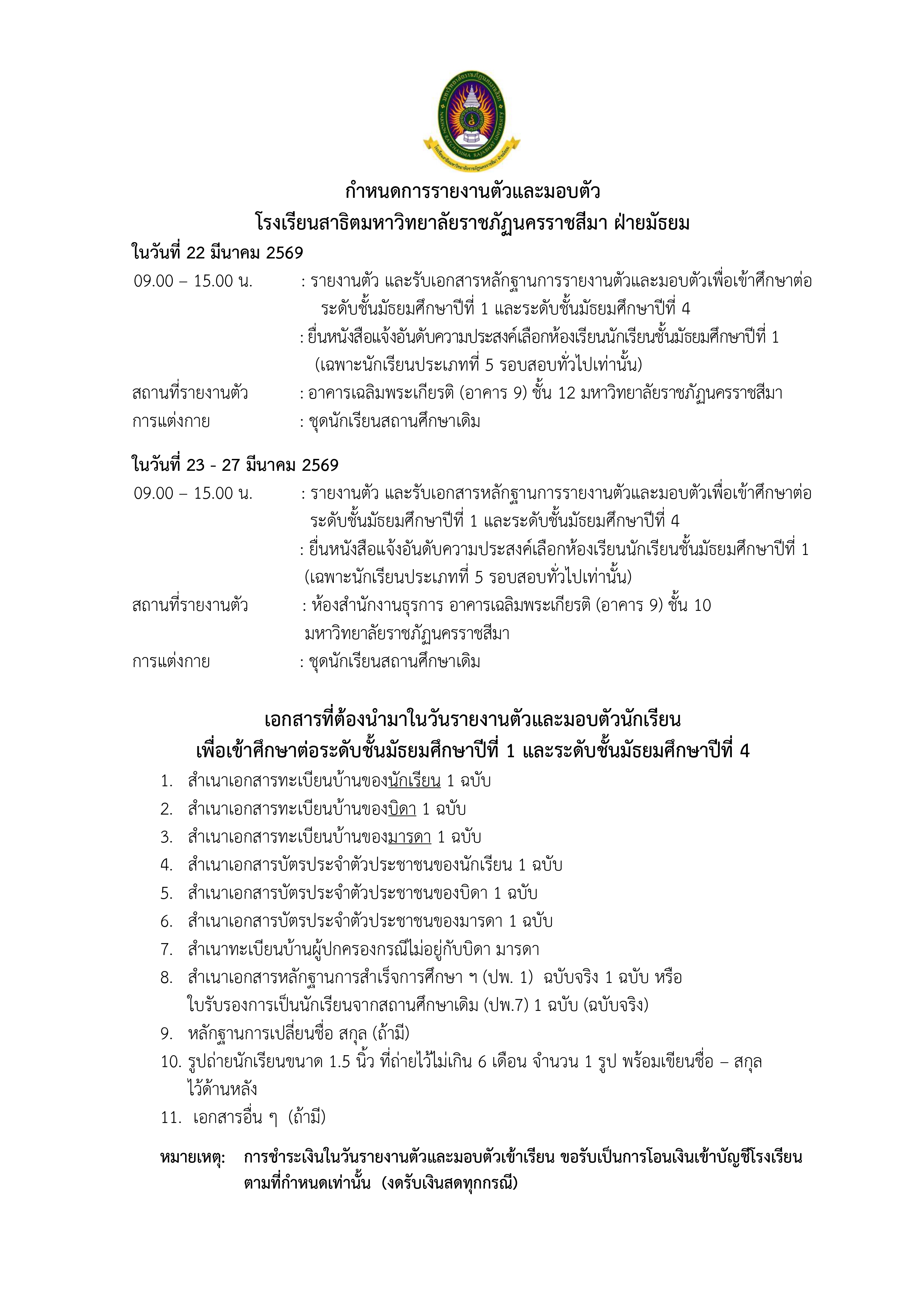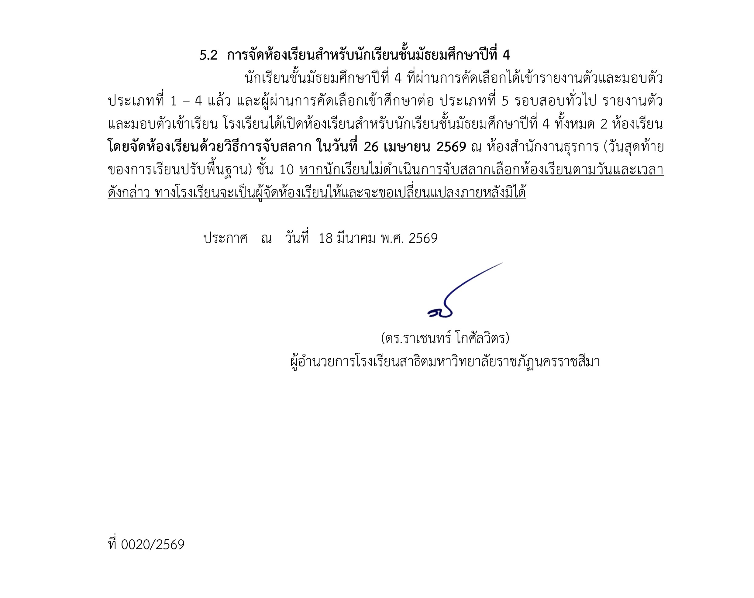 ประกาศรายชื่อผู้ผ่านการคัดเลือกเข้าศึกษาต่อในชั้นมัธยมศึกษาปีที่ 1 และ 4 ประเภทที่ 5 รอบสอบทั่วไป ปีการศึกษา2569